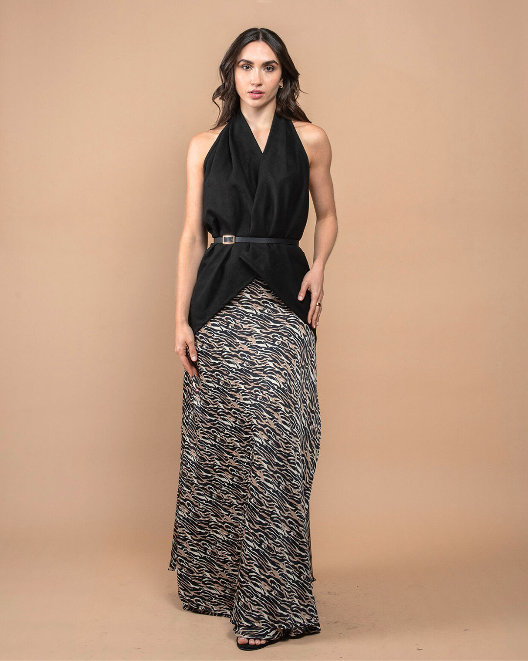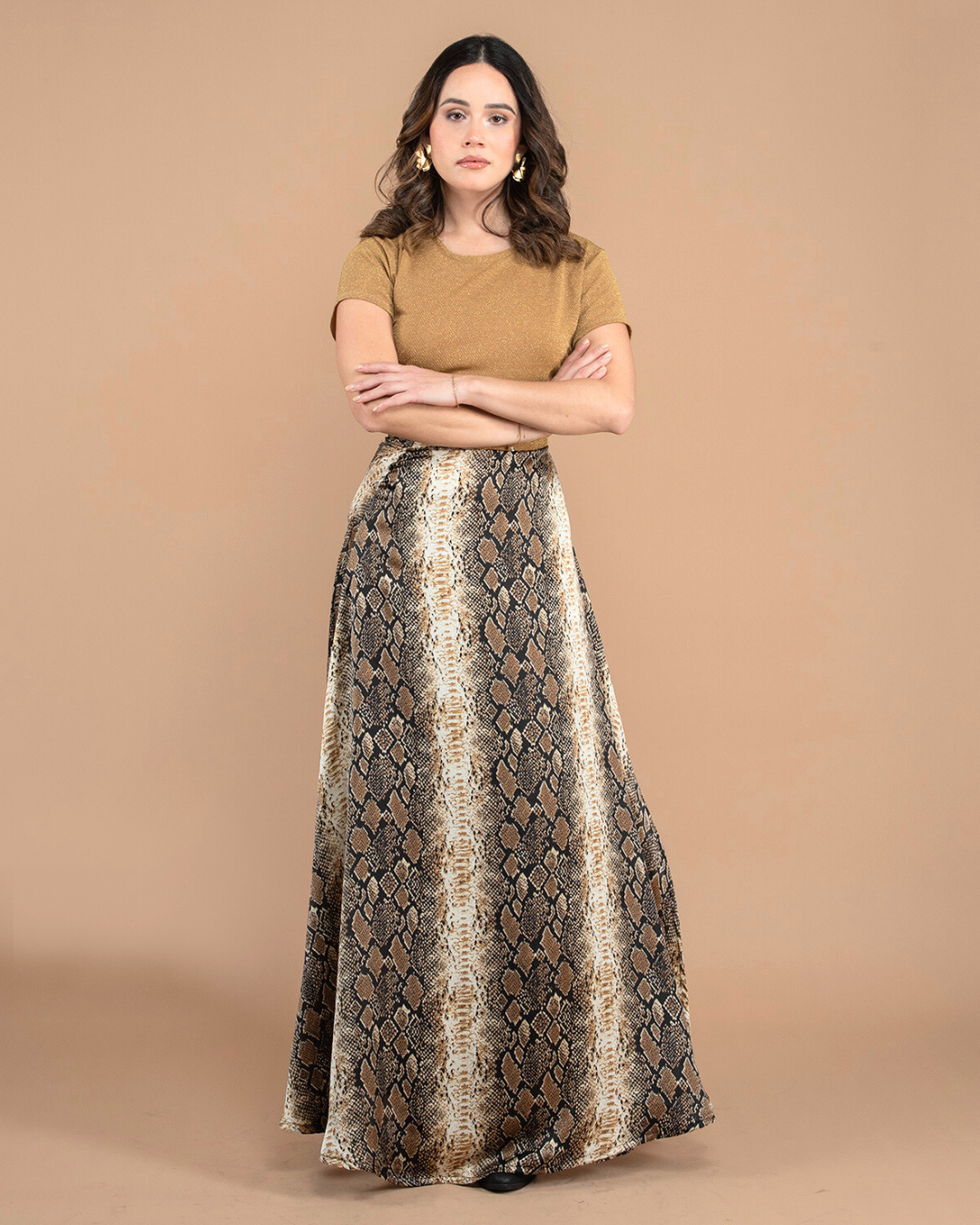 Falda de Satín, estilo semi-plato, se ajusta a la cintura gracias...